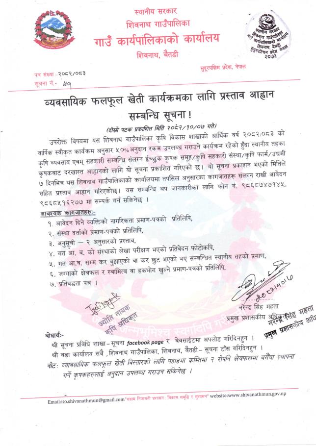 व्यवसायिक फलफूल खेती कार्यक्रमका लागि प्रस्ताव आह्वान सम्बन्धि सूचना !