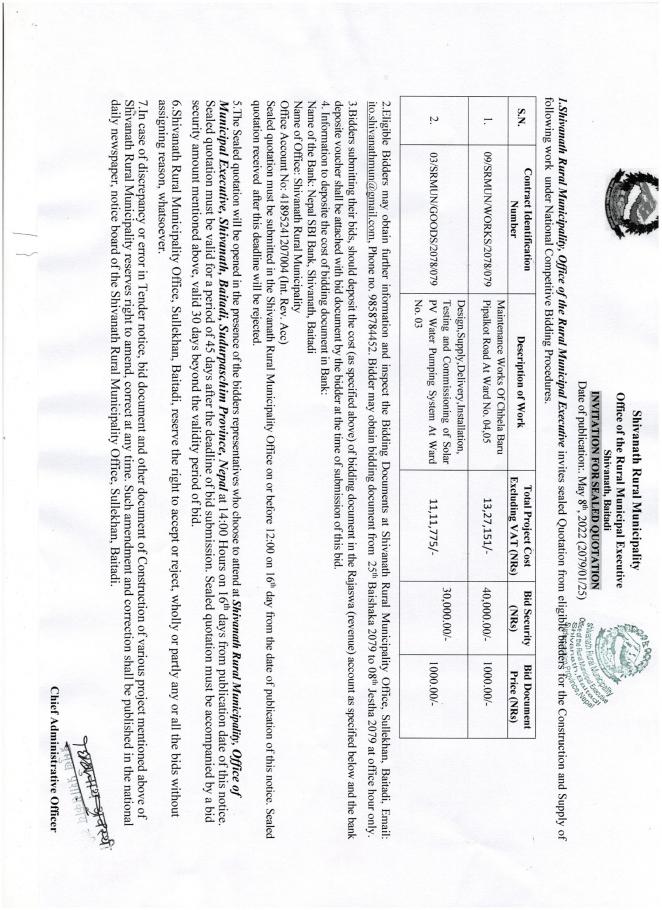 Invitation for sealed quotation (Date of publication May 8th, 2022(2079-01-25))